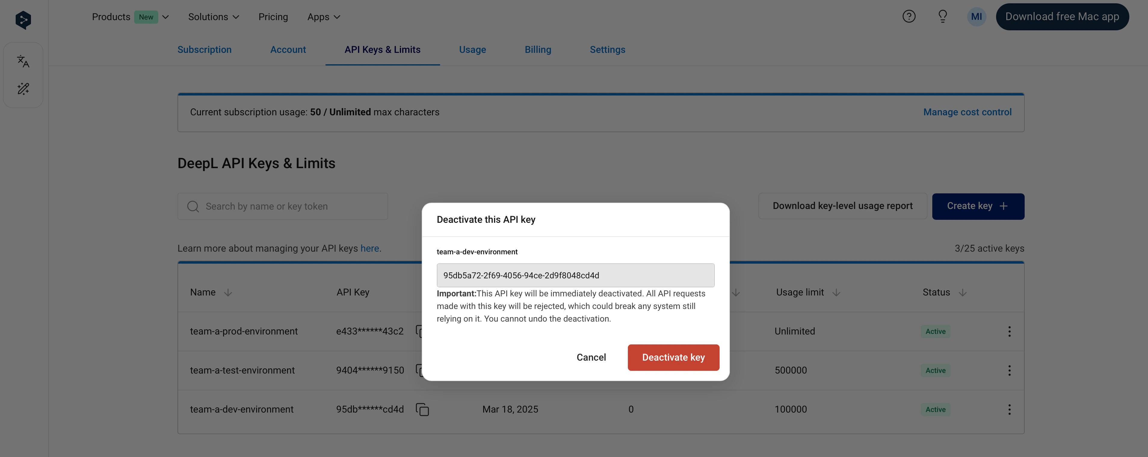 It’s possible to set an API key-level usage limit. Key-level limits restrict the number of total characters (across text translation, document translation, and text improvement) that can be consumed by an API key in a one-month usage period. You can see the dates of your current usage period in the Usage tab. For example, if you set a key-level usage limit of 1,000,000 characters, the API key will not consume more than 1,000,000 characters per usage period. In the “API Keys & Limits” tab, the “Characters consumed” column in the API keys table shows the number of characters consumed by an API key in the current usage period. The character count will “reset” at the start of the next usage period, at which point the key will again be able to consume characters. As with subscription-level cost control:- You’ll receive notification emails when 80% and 100% of a key-level limit has been reached